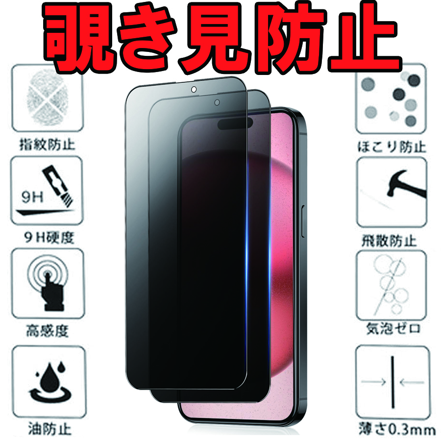 - 2枚入り iPhone15 Pro Max 覗き見 防止 ガラス フィルム 画面 保護 カバー シール シート アップル 横から見えない 頑丈 衝撃 Glass Film