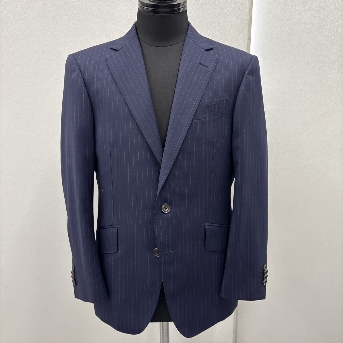 - 試着程度 イタリア グアベロ社製生地モーション ストレッチ スーツ ネイビーストライプ サイズ48相当 身長165体重70前後