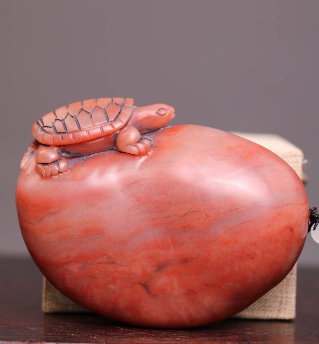 > 清時代 珍品寿山石 朱砂赤レリーフ 長寿カメハンドル 寿山田黄石彫 印章 印鑑 共箱 極細工 古置物 古擺件 中国古美術 古美味 時代物 821