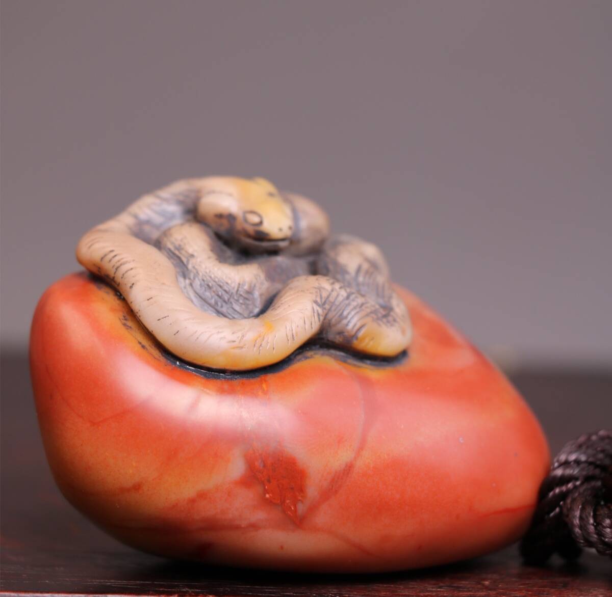 - 時代旧蔵 印章 珍品寿山石 朱砂赤レリーフ 金蛇狂舞ハンドル 時代古玉細密細工★古置物★古賞物★古擺件★蒐集家放出★唐物821