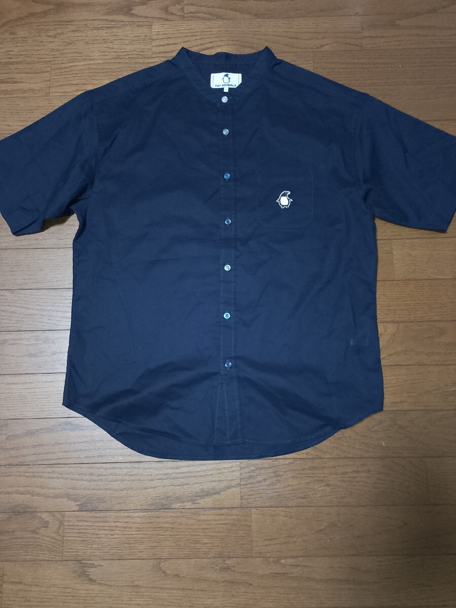 > Fat Animals (ファットアニマルズ) ノーカラー半袖シャツ Lサイズ ペンギン刺繍 きれいめ 動物 かわいい メンズ 紺