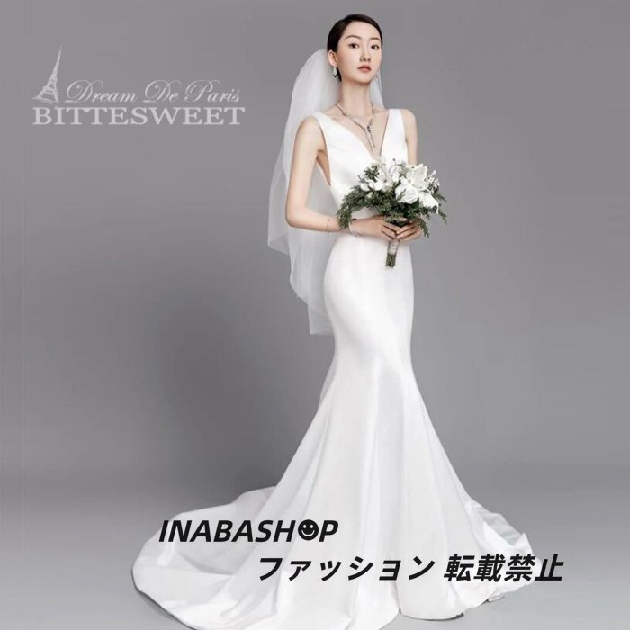 > ノースリーブ ウエディングドレス ウェディングドレス Vネック ファスナータイプ トレーンタイプ マーメイドタイプ 結婚式 海外挙式ドレス
