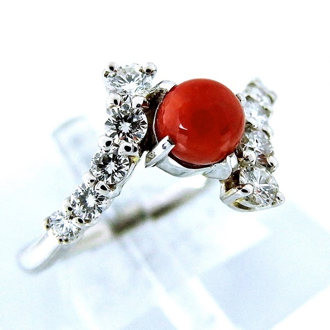 > Pt900 ★リング ◆サンゴ4.7ミリ 3月誕生石 ◇ダイヤ0.414ct ●14号◆ソーティング付 【中古・新品仕上げ済】 /27018/10009929