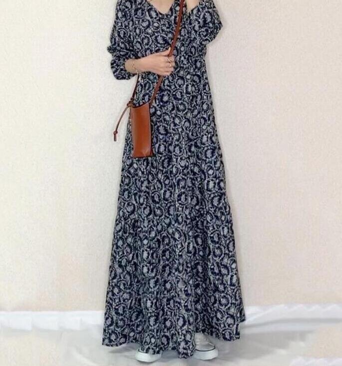 > ワンピース プリカバー 長袖 プリント Vネックント マキシ丈 体型 レディース 春夏 サラロングワンピース ッとした肌触り着痩せ