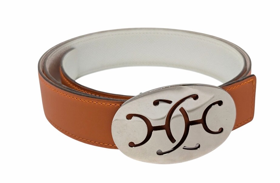> エルメス ベルト Hリフト キス バックル ボックスカーフ トゴ オレンジ 白 HERMES レザー 90cm 【中古】