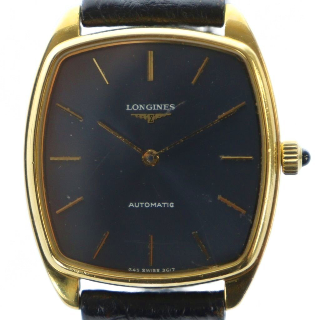 - ロンジン LONGINES ジャンク品 腕時計 ウォッチ 自動巻き ロゴ スクエア レザーベルト 黒文字盤 ゴールド色 G45-3617