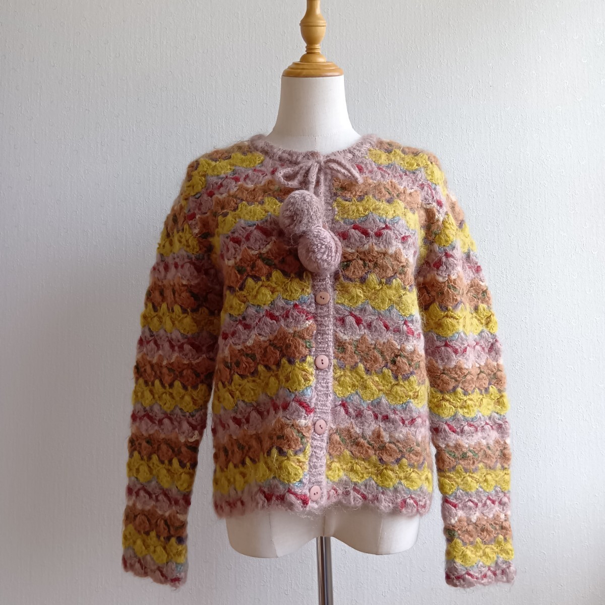 > WONDERFUL WORLD ワンダフルワールド カネコイサオ パターンニットカーディガン モヘヤ ウール ポンポン