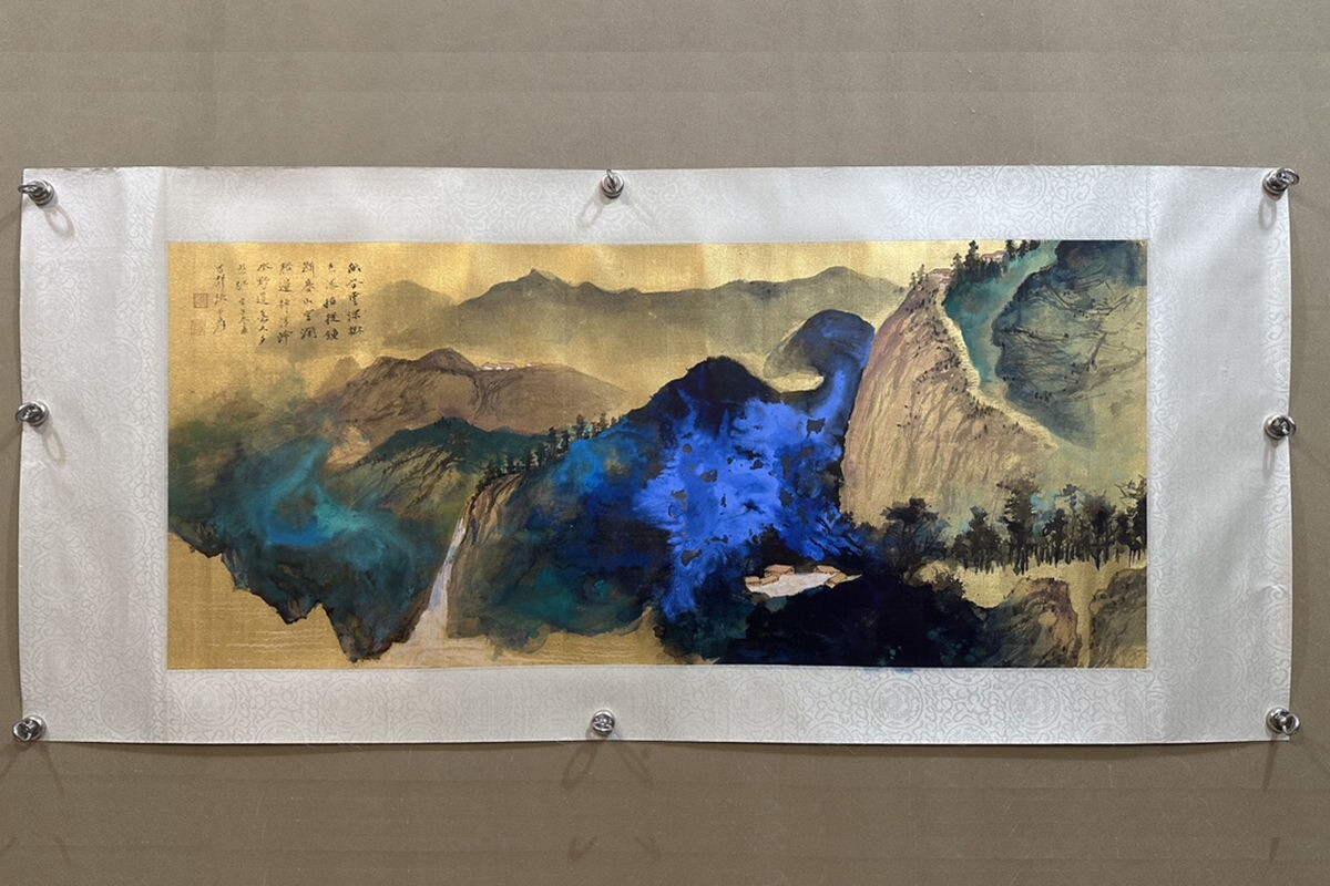 - 中国書画「張大千 溌彩山水図鏡心」肉筆絹本 掛け軸 墨寶妙品 書画横軸 巻き物 古美術 旧蔵出