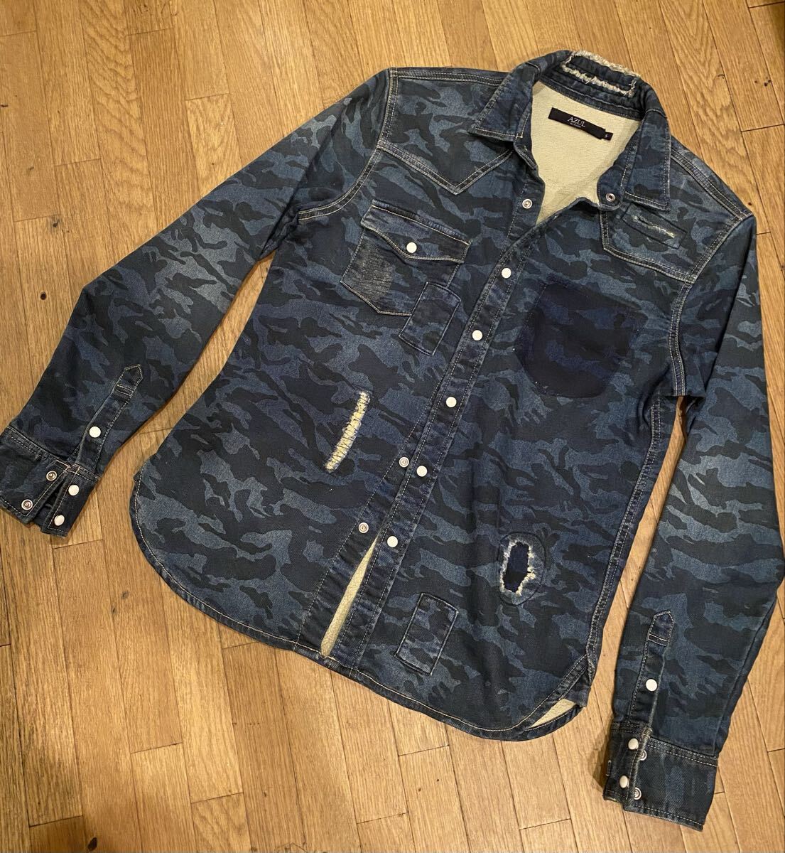 - 美品デニムジーンズダンガリーシャツカモフラダメージリペアクラッシュ風スウェット素材トレーナーグランジAZUL moussy