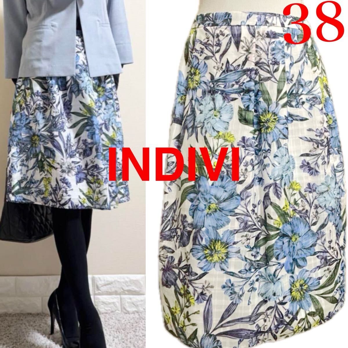 - 美品!INDIVI インディヴィ 定価14,500円 日本製 洗える シャドーチェック 花柄 スカート 38 M ブルー系 フラワー ボタニカル
