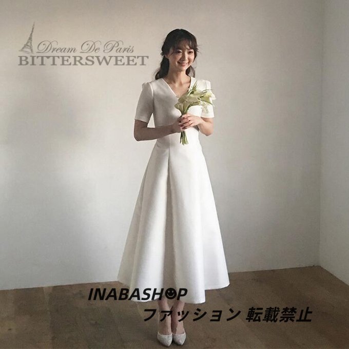 - ウェディングドレス ウエディングドレス ワンピース Aライン パフスリーブ ミモレ Vネック 披露宴 結婚式 演奏会 発表会 海外挙式ドレス