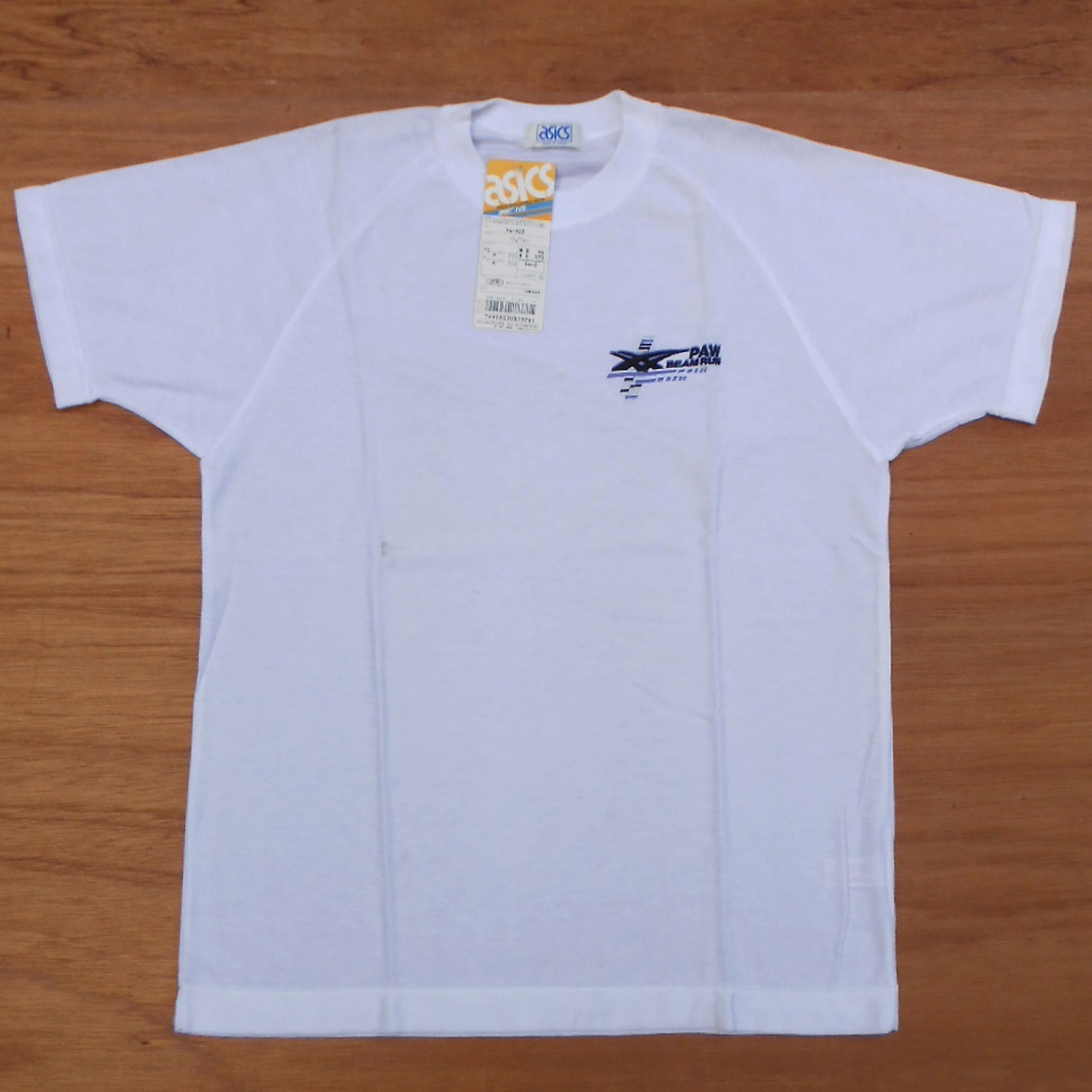 > 未使用 '90s asics PAW アシックス パウ L 半袖 Tシャツ 白x黒x紫 バッタxロゴ刺繍 ホワイト ゴールドタイガー 日本製 デッドストック T/C