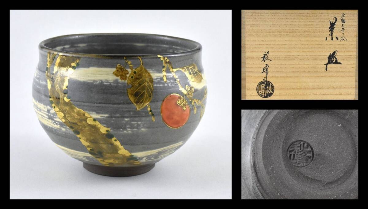 - ▲楠廸庵▲灰釉木守り絵茶碗 中村秋峰作 茶道具