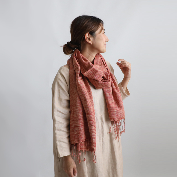 - 秋 最終SALE 手紡 草木染め糸 手織り布 大判ストール コットン ショール マフラー 日差し除け レッドmix E61F