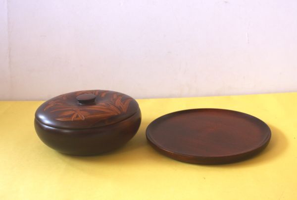 - 未使用品 盆付菓子器 サギ草 木製 木彫りの蓋付き器とお盆のセット 箱なし/27N8.7-76