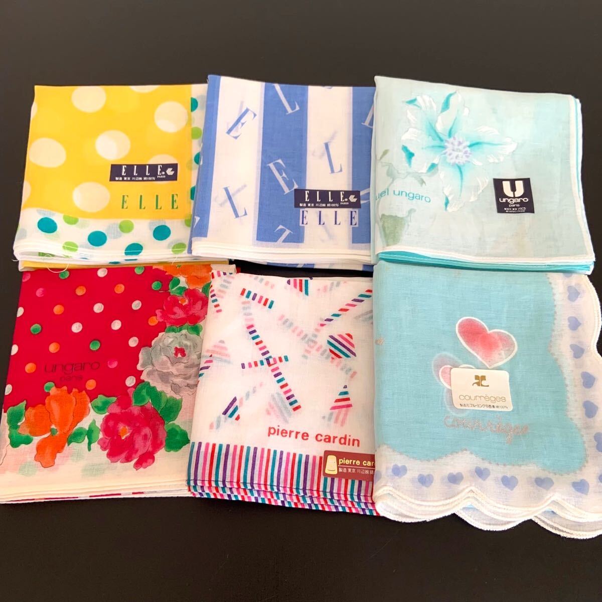 - 未使用 ELLE エル ungaro paris ウンガロ ピエールカルダン courreges 大判 ハンカチ 6枚セット 綿100% 総柄 花柄 レディース まとめ売り