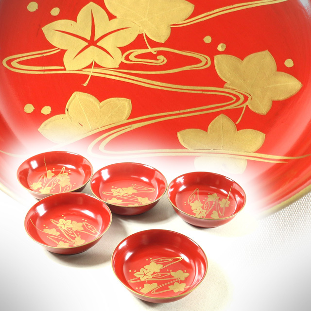 ●c1044●極上【蒔絵菓子皿5客 観世波紅葉 朱】検お茶会煎茶道具茶懐石道具吸皿酒木皿つまみ皿輪島塗●西瓜●