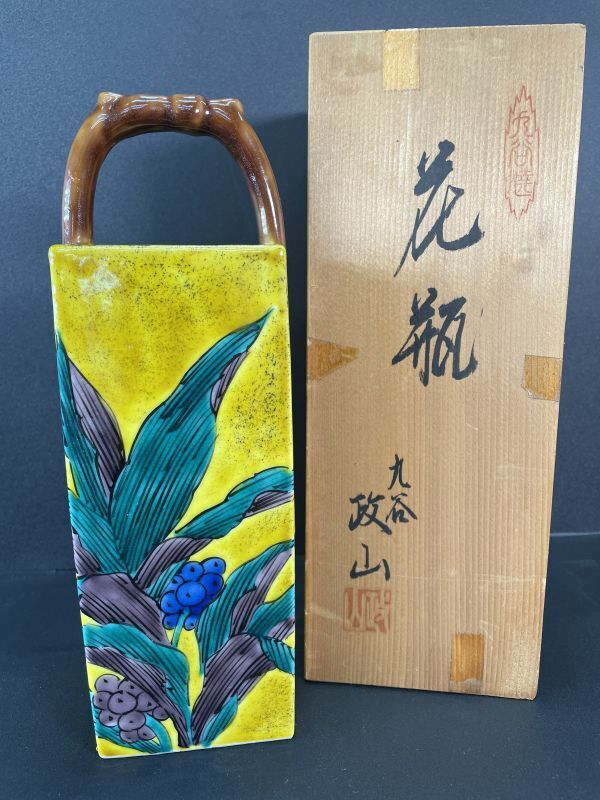 > 九谷焼 政山作 九谷花瓶 8×8×H25cm 692g 共箱 陶磁器 陶器 日本伝統工芸 花入 花器 花生 飾壷 華道具 木箱 花瓶(11479)