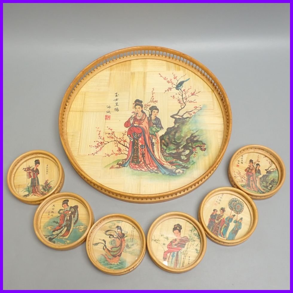 - ◆未使用 中国土産 竹製 トレイ + コースター 6客 セット/丸盆/玉女呈瑞/竹細工/伝統工芸&0000006623