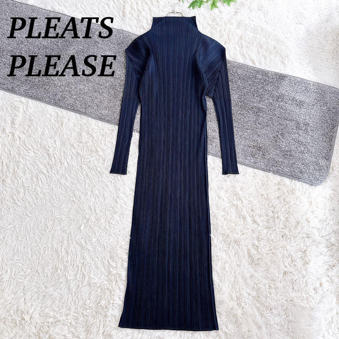 - 美品 総丈132㎝ PLEATS PLEASE プリーツプリーズ ISSEY MIYAKE 長袖 ハイネックロングワンピース ネイビー イッセイミヤケ