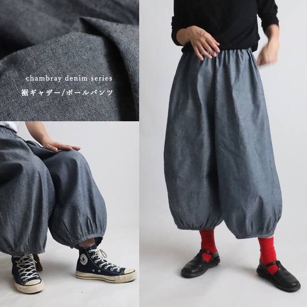 - 最終SALE 86cm シャンブレーデニム コットン ウォッシュ加工 裾ギャザー サーカス ボール パンツ ゆったり F43