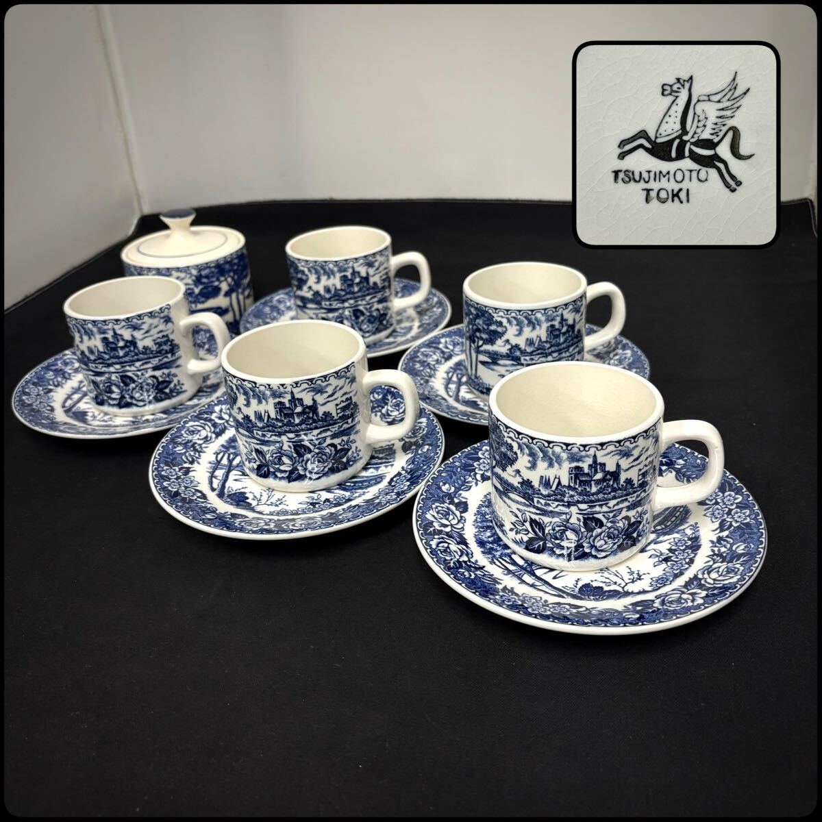 > ヴィンテージ 辻本陶器 カップ ソーサー 5客セット シュガーポット付 ティーセット ブルー ロイヤル キャッスル ガーデン 洋食器 (08297E