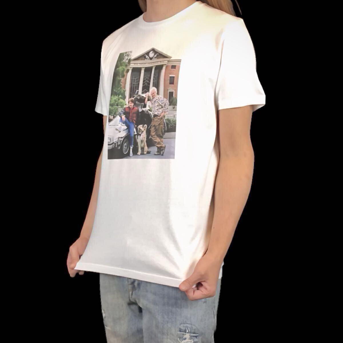 > 新品 バックトゥザフューチャー2 マーティ ドク アインシュタイン ヒルバレー 時計台 記念撮影 80年代映画 Tシャツ ユニセックス Sサイズ