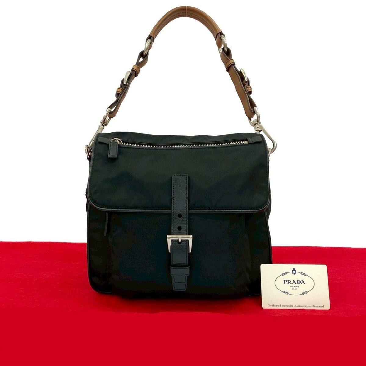 > 極 美品 PRADA プラダ 三角ロゴ 金具 サフィアーノ レザー 本革 ナイロン ハンドバッグ ワン ショルダーバッグ ブラック ブラウン 83297