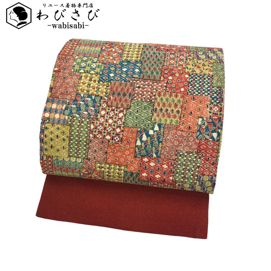 > 名古屋帯 型染 多様な柄裄 猩々茶色 縮緬 O-5363 着物 きもの kimono 和服 和装 中古 リサイクル着物 【送料無料】