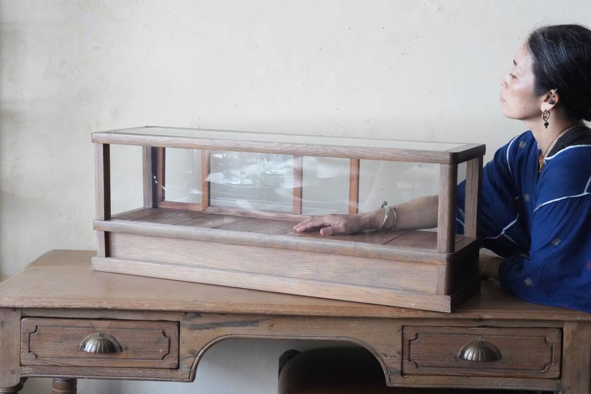 > ショーケース アンティーク 大正ロマン ディスプレイ 店舗什器 木製 卓上 木枠 インテリア 古家具 ビンテージ ガラス棚 ②