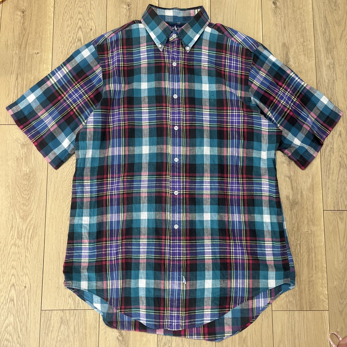 > Ralph Lauren ラルフローレン 半袖シャツ 手織りマドラス生地 ボタンダウンシャツ Lサイズ 好配色 90s シンガポール製