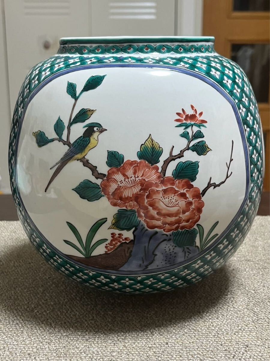 - 九谷焼 色絵丸紋割取花鳥 飾壷 三代為吉 三ツ井詠一 造
