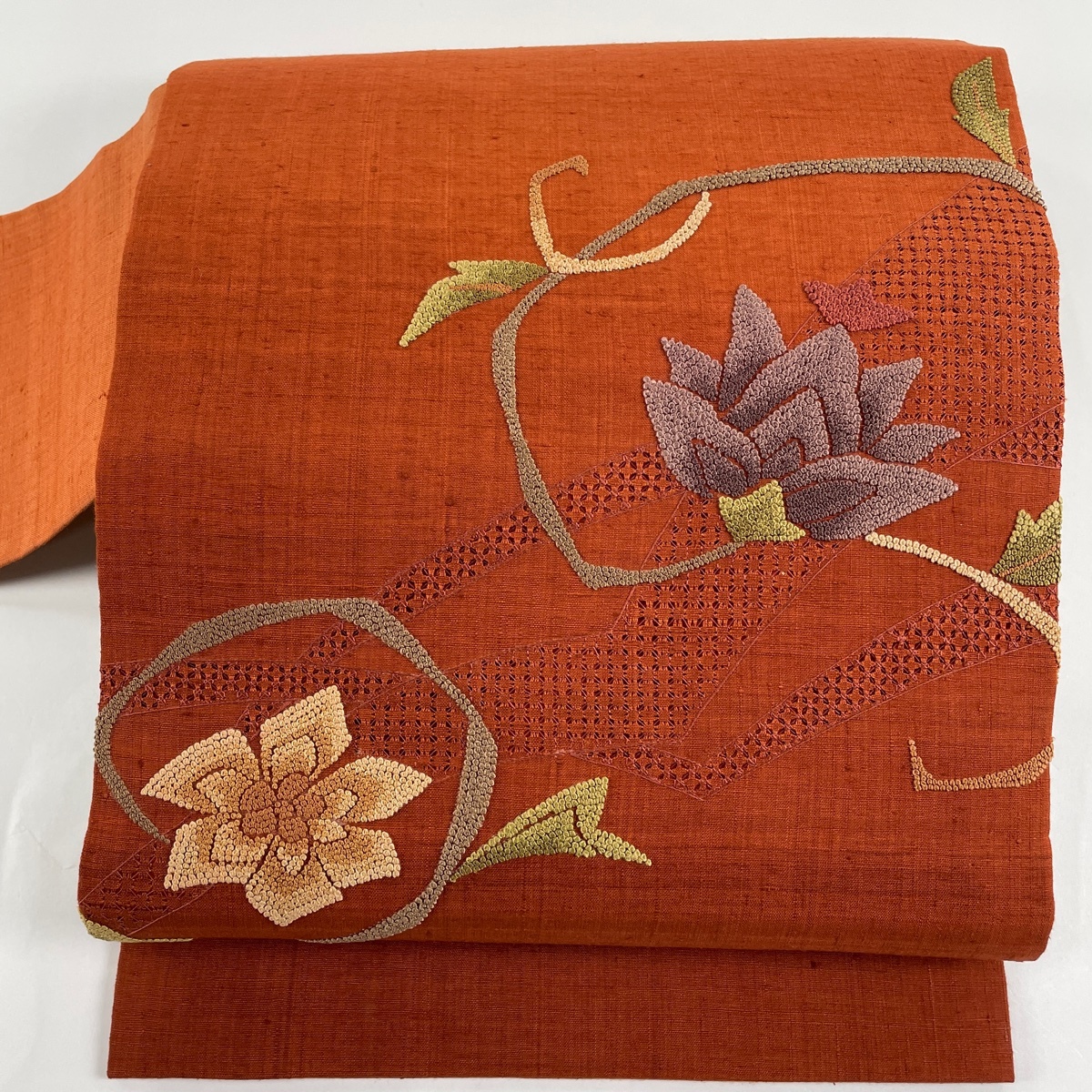 - 名古屋帯 美品 秀品 紬地 草花 刺繍 赤茶 正絹 【中古】