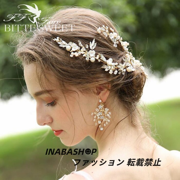 - 2点セット イヤリングorピアス ヘッドドレス アクセサリー セット 髪飾り ウェディング小物 ヘアコサージュ フラワーティアラ 花かんむり