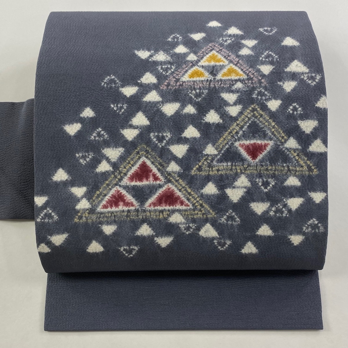 - 名古屋帯 逸品 福村廣利 落款 鱗 幾何学 絞り 青灰色 正絹 【中古】