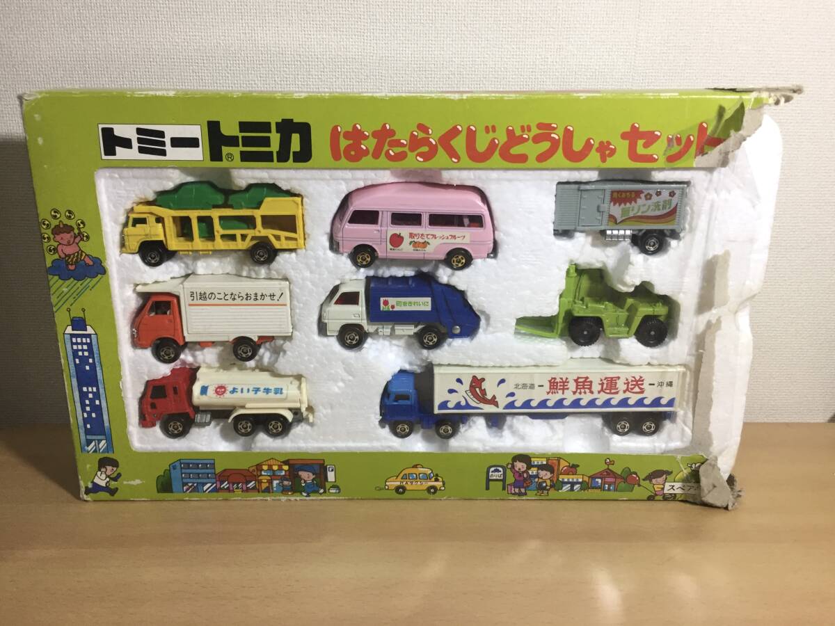 > ○[車体美品 完品8個] トミカ はたらくじどうしゃセット 日本製 TOMICA 元箱付 ミニカー トレーラー 清掃車 フォークリフト タンクローリー