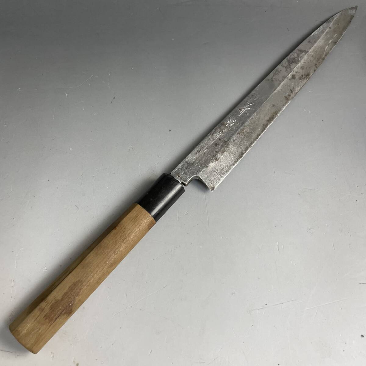 > FNY31/47 兼松作 柳刃包丁 安来鋼 水牛柄 全長417mm 刃渡り264mm 刃幅34mm 厚さ4mm 重さ171g 職人 刺身包丁 現状品◎
