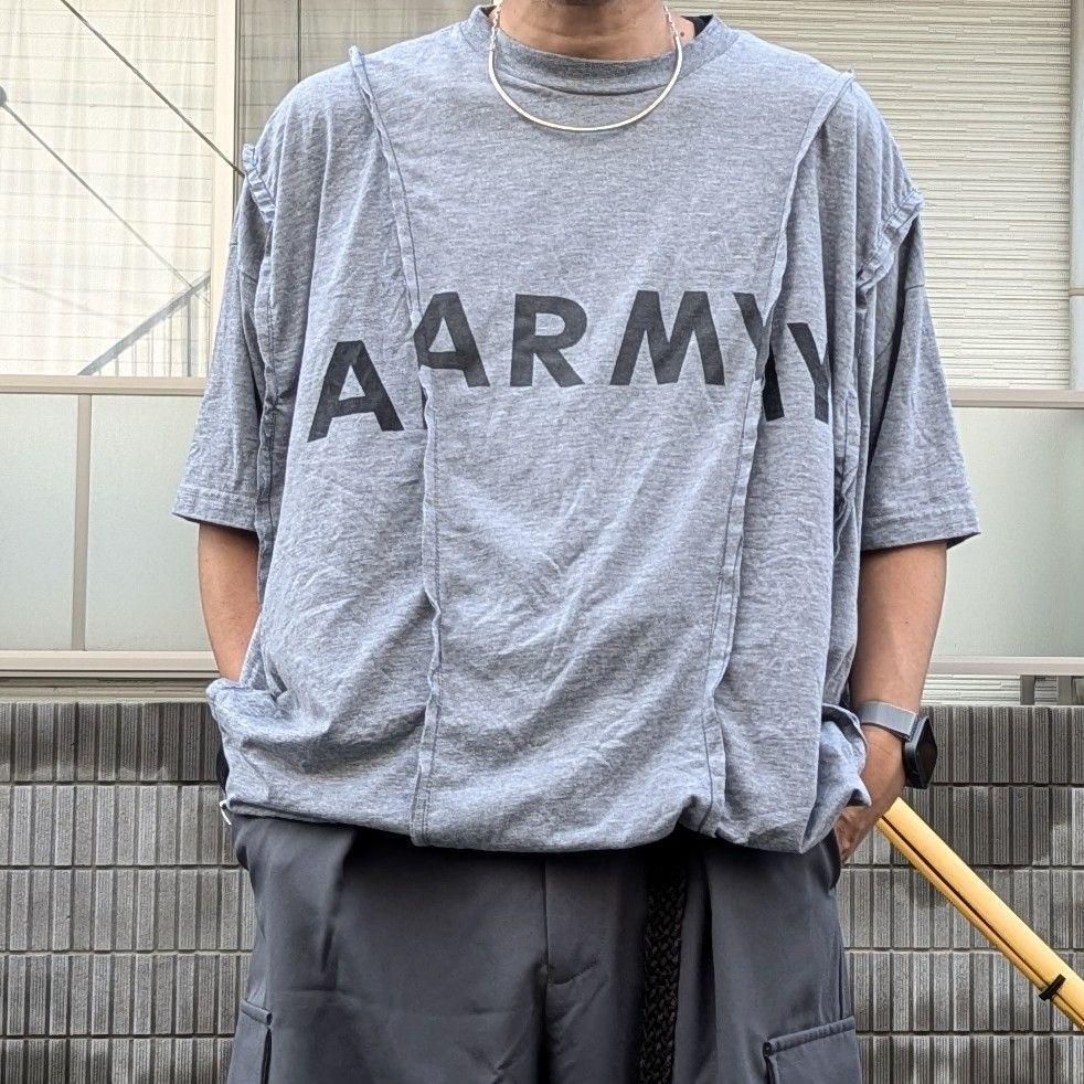 - ⑪オリジナルリメイク オーバーサイズ ドッキング ワイド Tシャツ ドローコード グレー アーミー 半袖 トップス しぼり 大きいサイズ