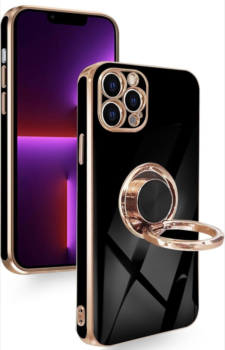 - iPhone 13 ProMax ケース リング付き 360°回転スタンド機能 耐衝撃 アイフォン 13ProMax 薄型 軽量 メッキ加工 ブラック 黒