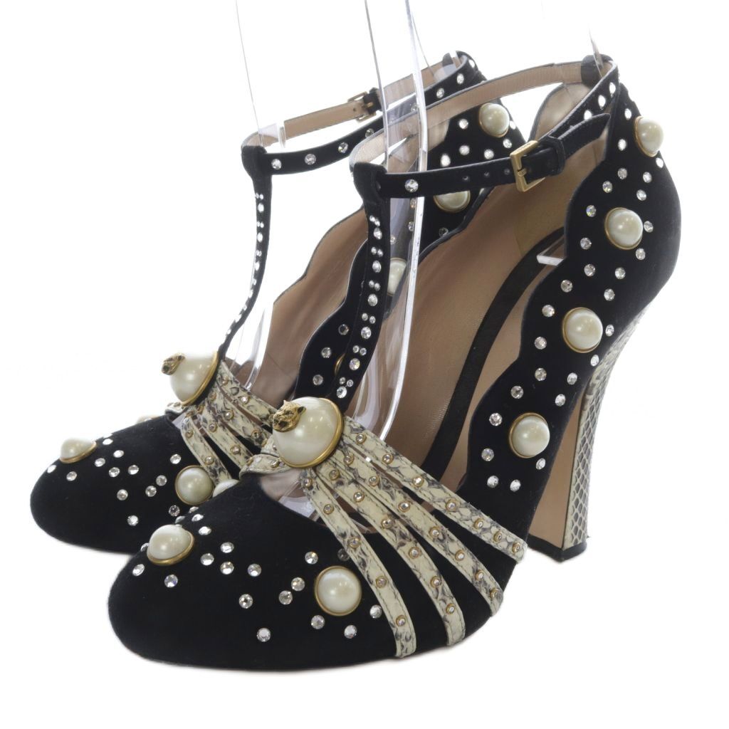 > グッチ GUCCI ビジュー パール パイソンヒール パンプス 39.5 黒 ブラック アイボリー 447601 /SR21 レディース