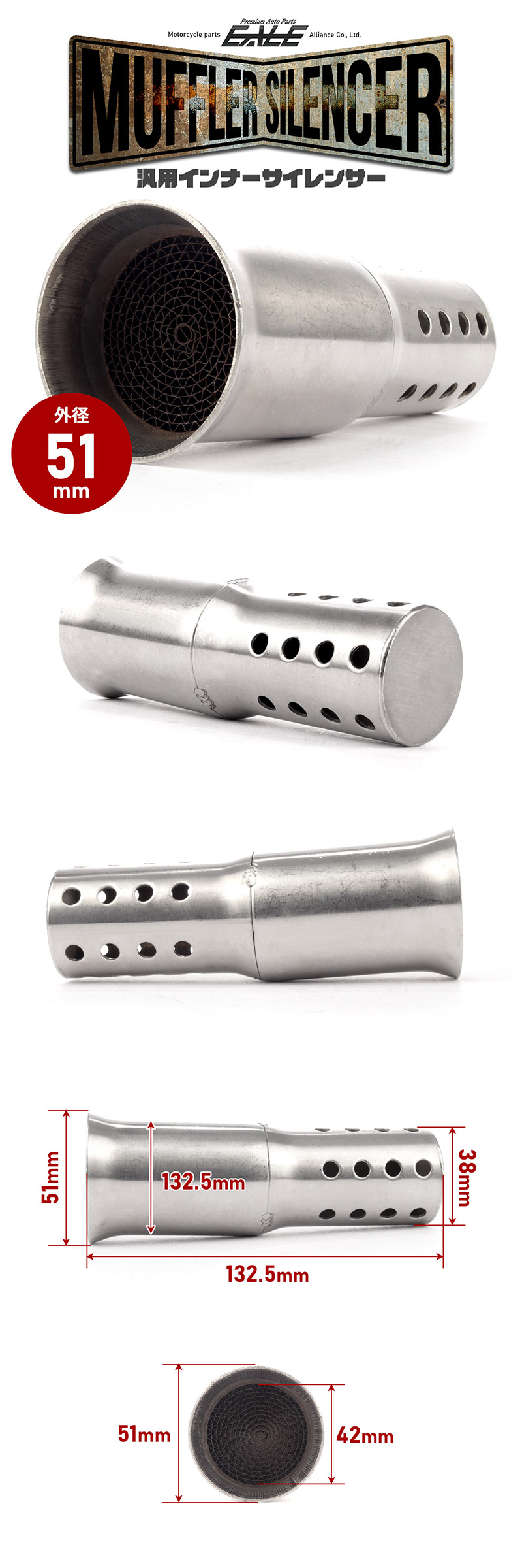 > バイク 汎用 外径51mm サイドホール LL 触媒型 マフラー インナーサイレンサー バッフル 消音器 ステンレス 排気音抑制 S-1019