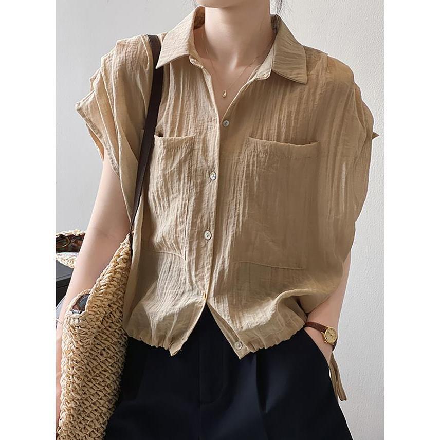 - シャツドローコード半袖シャツ 高級感ブラウス開襟シャツ 半袖パフスリーブシャツ レディースカジュアルシャツ ゆったり半袖トップス