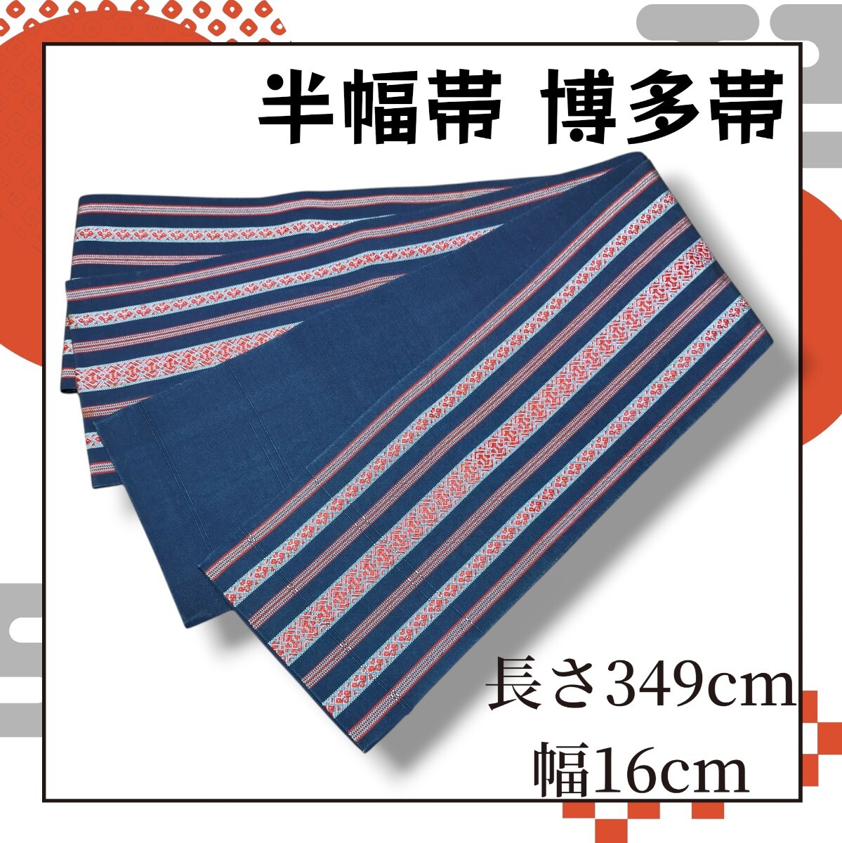 - 博多織 半幅帯 献上柄 小袋帯 本場筑前博多帯 単衣帯 紺地赤模様