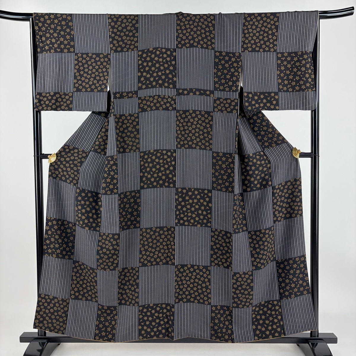 - 小紋 身丈156cm 裄丈65.5cm M 袷 桜 竹縞 黒灰 正絹 優品 【中古】