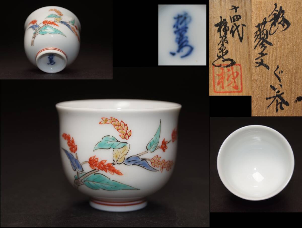- 真贋保証■人間国宝 十四代 酒井田柿右衛門 作■ 錦 蓼文 ぐい呑 共箱・栞付 酒杯 盃 酒器 酒盃 お猪口 色絵 検:日本酒 酒肴 懐石 料亭