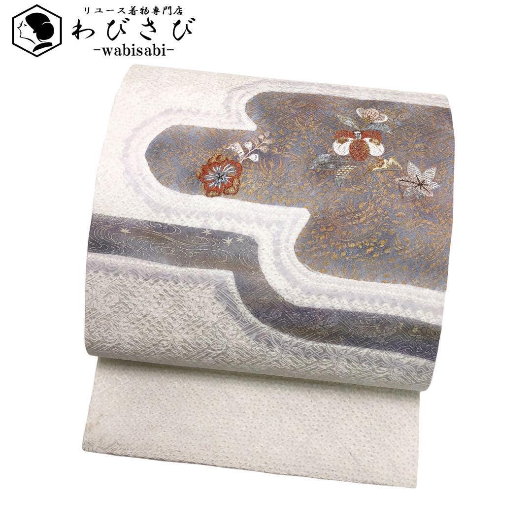 > 京袋帯 エ霞に花模様 絞り 刺繍 紗綾形 金糸 乳白色 O-3206 着物 きもの kimono 和服 和装 中古 リサイクル着物 【送料無料】