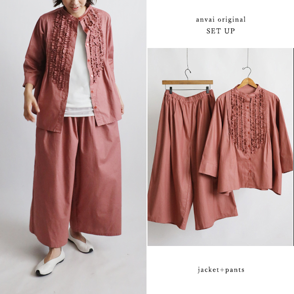 > 最終SALE 上下セットアップ ギマ擬麻コットン 小花フリル シャツ と 前後タック入 ワイド パンツ 大人ピンク A20B