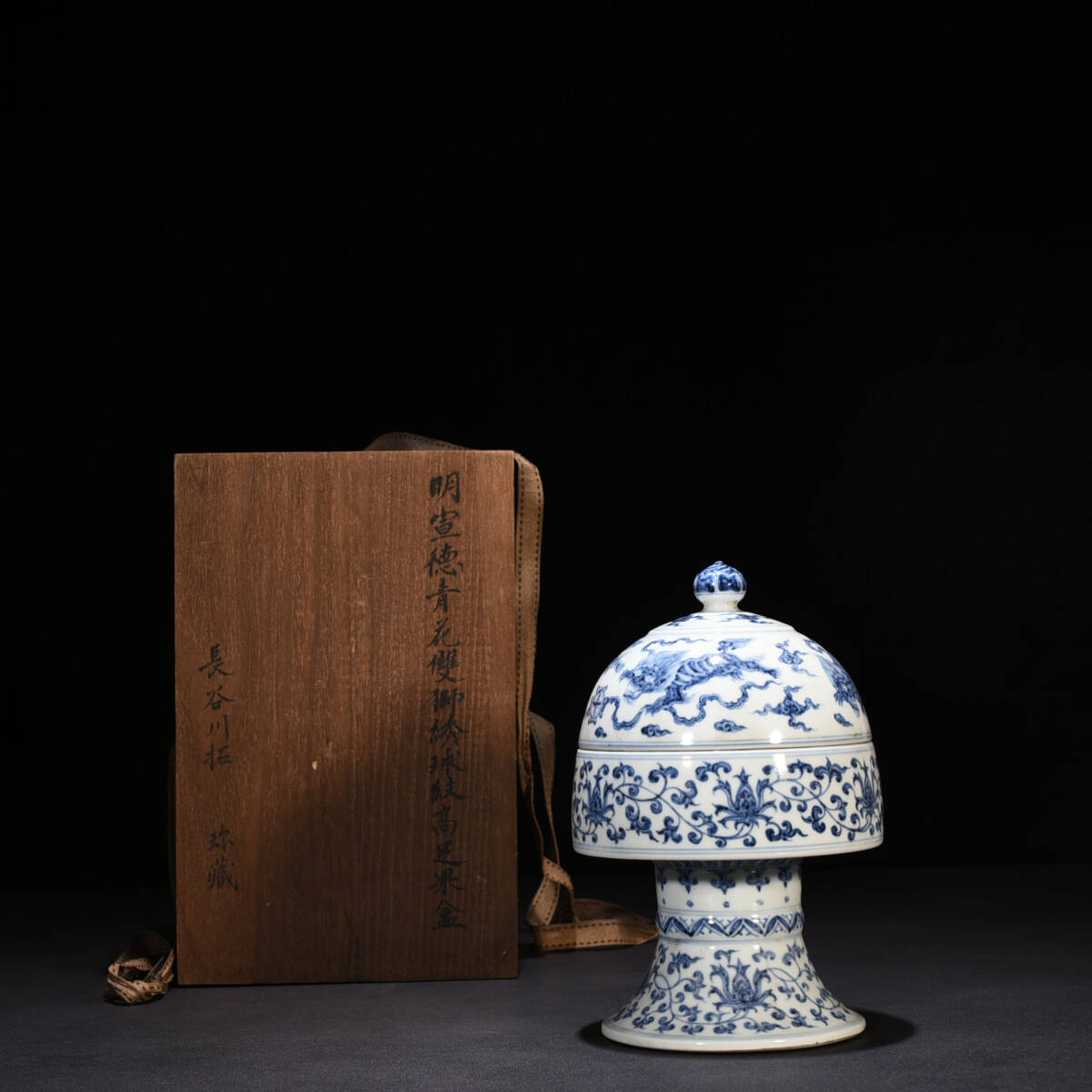 > ◆珍蔵◆中国古美術 大明宣徳年製款 青花 纏枝蓮 双獅子戯球紋果盒 共箱 美品 細密細工造 置物 擺件 古賞物 骨董 時代物 A33