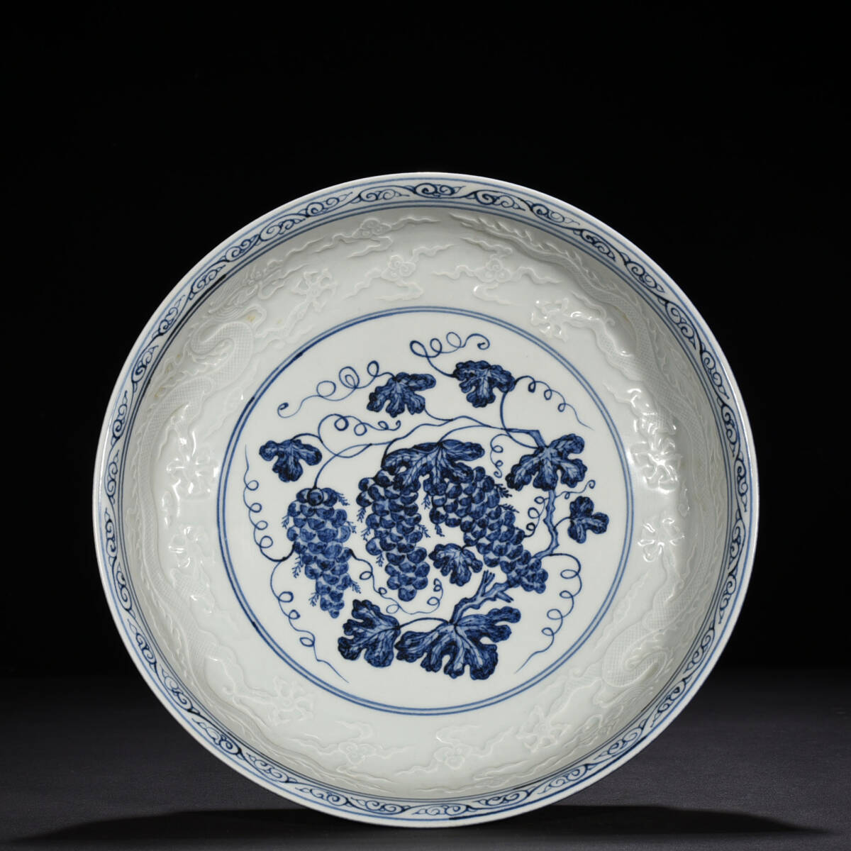- ◆珍蔵◆中国古美術 大明永樂年製款 青花 葡萄紋大盤 美品 細密細工造 置物 擺件 古賞物 骨董 時代物 A33