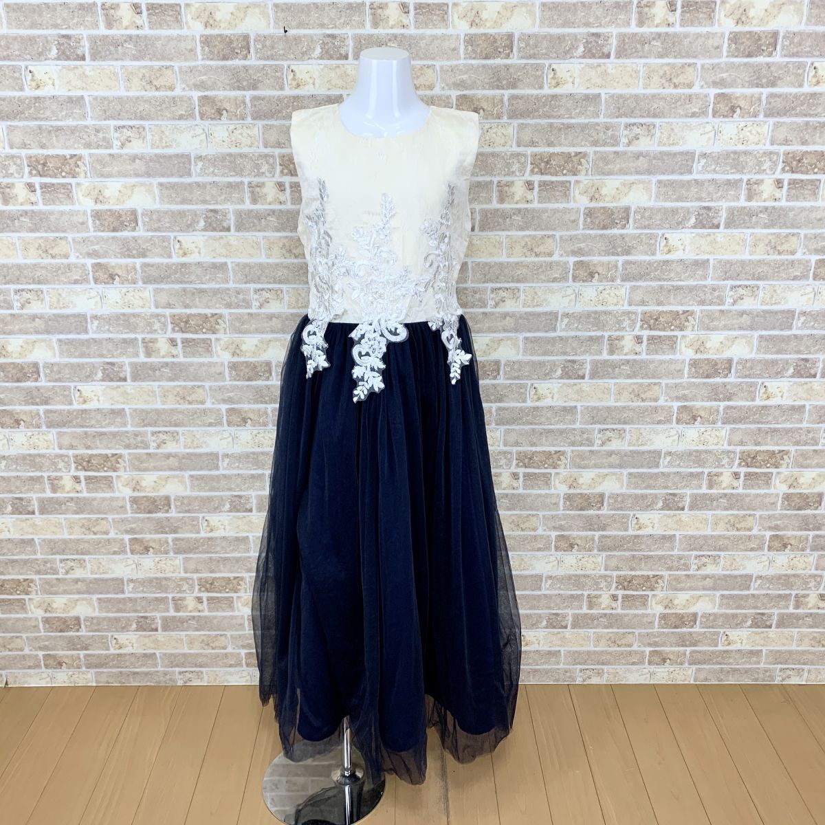 - 子供ドレス ワンピース 150 ベージュクリームネイビー系 カラードレス 発表会 イベント 中古13940